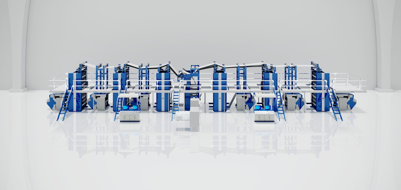 Single-width, single-circumference web-offset press running up to 30,000 copies per hour. Configurable as Mono Unit, 3-Colour Satellite, or 4 High Tower — 4 colours on both sides of one web, 2 colours on both sides of two webs, or single colour on both sides of three webs.